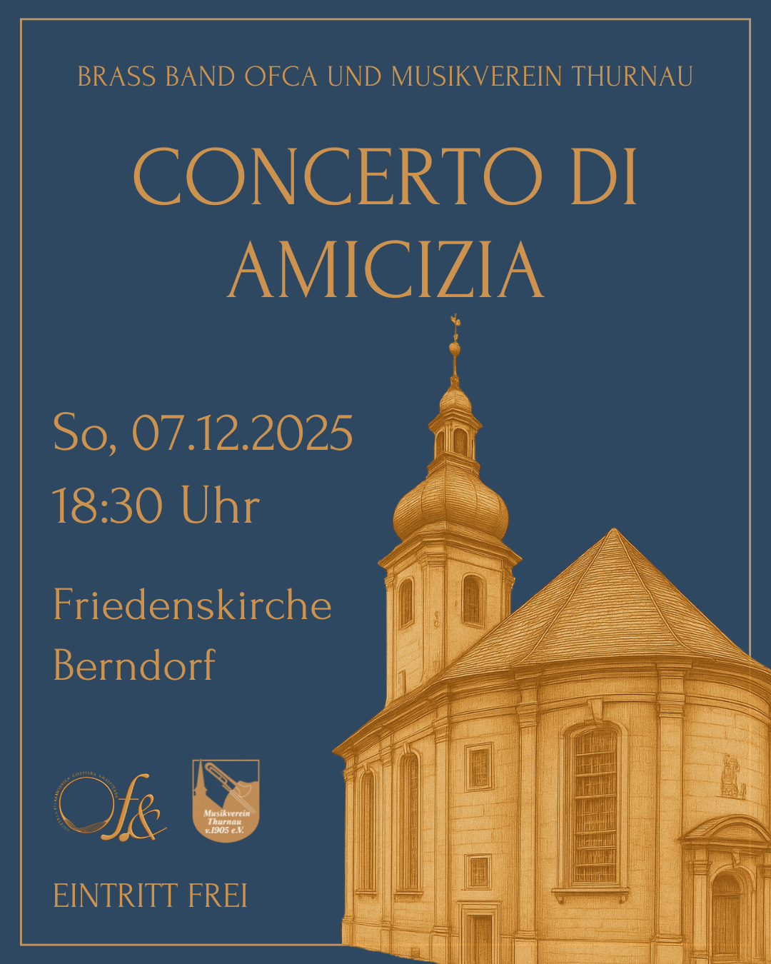 Anlässlich des 25-jährigen Jubiläums der Städtepartnerschaft Thurnau Positano spielen wir mit unseren Musikerfreunden der Brass Band des Orchestra filarmonica cositera amalfitana in der Friedenskirche in Berndorf. Freut euch auf einen bunten Mix aus Klassikern der italienischen Oper, moderner Filmmusik und weihnachtlichen Klängen.