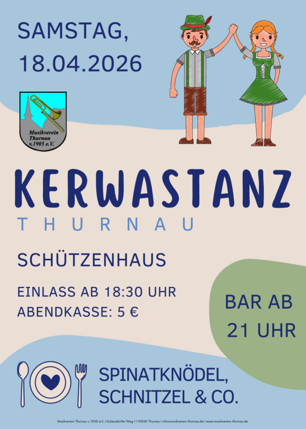 Thurnauer Kerwastanz Play Pause Wann 18. April 2026 18:30 Uhr Zum Kalender hinzufügen ICS herunterladen Google Kalender iCalendar Office 365 Outlook Live Wo Schützenhaus Thurnau Kasendorfer Str. 9, Thurnau, 95349
